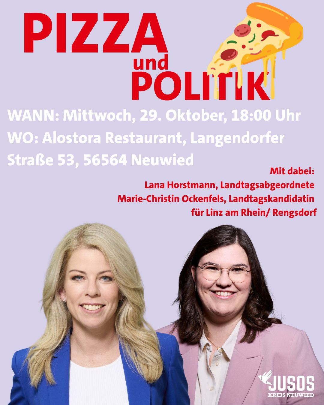 Unter dem Motto „Pizza & Politik – Sag’s mir direkt!“ laden die Jusos im Kreis Neuwied, die Landtagsabgeordnete Lana Horstmann und die SPD-Landtagskandidatin Marie-Christin Ockenfels junge Menschen zwischen 14 und 35 Jahren am Mittwoch, 29. Oktober 2025, um 18:00 Uhr ins Alostora Restaurant, Langendorfer Straße 53, 56564 Neuwied, zu einem lockeren politischen Austausch ein.