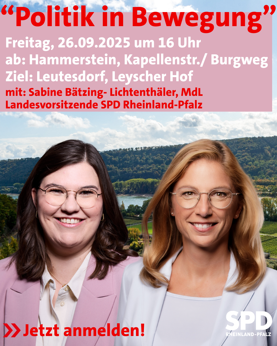 Unter diesem Motto laden die SPD-Landtagskandidatin für den Wahlkreis Linz/Rengsdorf, Marie-Christin Ockenfels und die Landesvorsitzende der SPD Rheinland-Pfalz Sabine Bätzing-Lichtenthäler, MdL am Freitag, 26. September um 16:00 Uhr zu einer Wanderung von Hammerstein nach Leutesdorf ein.